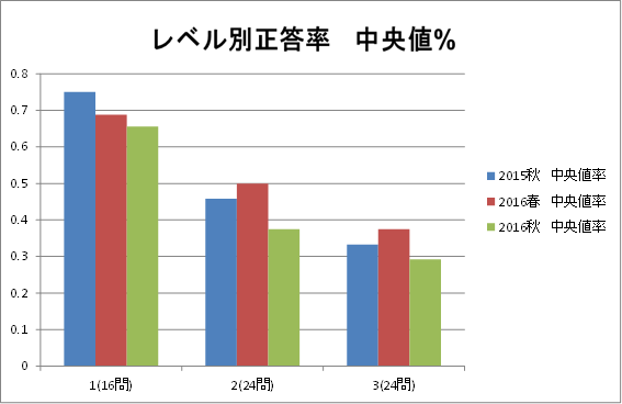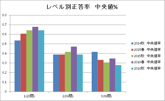 レベル別に見ると、正答中央値率が、レベル1で66%程、レベル2で38%程、レベル3で29%程となっています。総合試験と比較すると、レベル1で1%程向上、レベル2で1%程減少、レベル3で1%程向上しています。