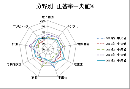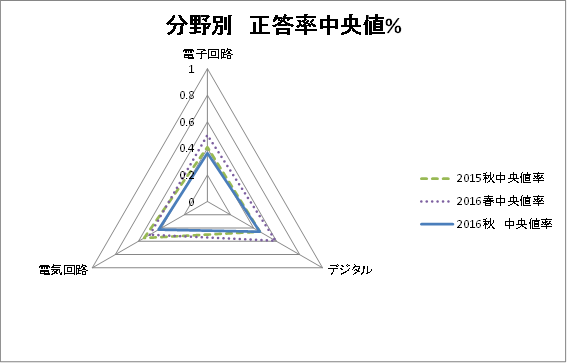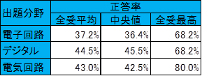 分野別では、デジタルと電気回路がほぼ等しく、電子回路が6~9%難しい結果となっています。