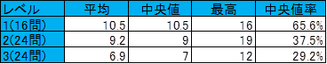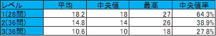 レベル別に見ると、基礎のレベル1から応用のレベル3になるに従って正答数が下がっています。難度の判断基準として、正答率の中央値に着眼すると、レベル1で64%、レベル2で39%、レベル3で28%です。得点は、レベルに係らず1問1点です。